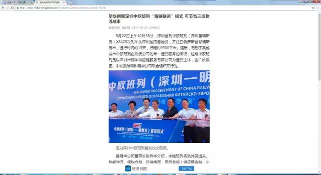 5月22日上午10时38分,深圳首列中欧班列(深圳至明斯克)X8428次列车从深圳盐田港始发,开往白俄罗斯首都明斯克市,运行时间约13天,行程约9900千米。据悉,有别于其他城市中欧班列由物流公司的单一运营服务的情况,这趟中欧班列是以深圳市朗华供应链服务有限公司为运营主体,由广铁集团、中铁集装箱和朗华公司联合组织开行的。