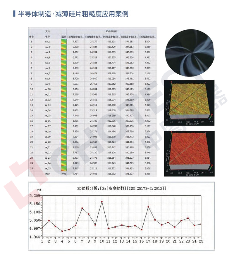 减薄工序中粗磨和细磨后的硅片表面3D图像,用表面粗糙度Sa数值大小及多次测量数值的稳定性来反馈加工质量。在生产车间强噪声环境中测量的减薄硅片,细磨硅片粗糙度集中在5nm附近,以25次测量数据计算重复性为0.046987nm,测量稳定性良好。